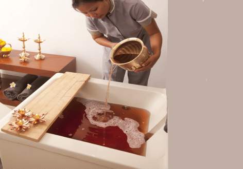 During Avagahasweda, the entire body is submerged in a warm bath, infused with a medicated herbal decoction. This therapy is used for those who suffer from hernia and painful micturition in the body.